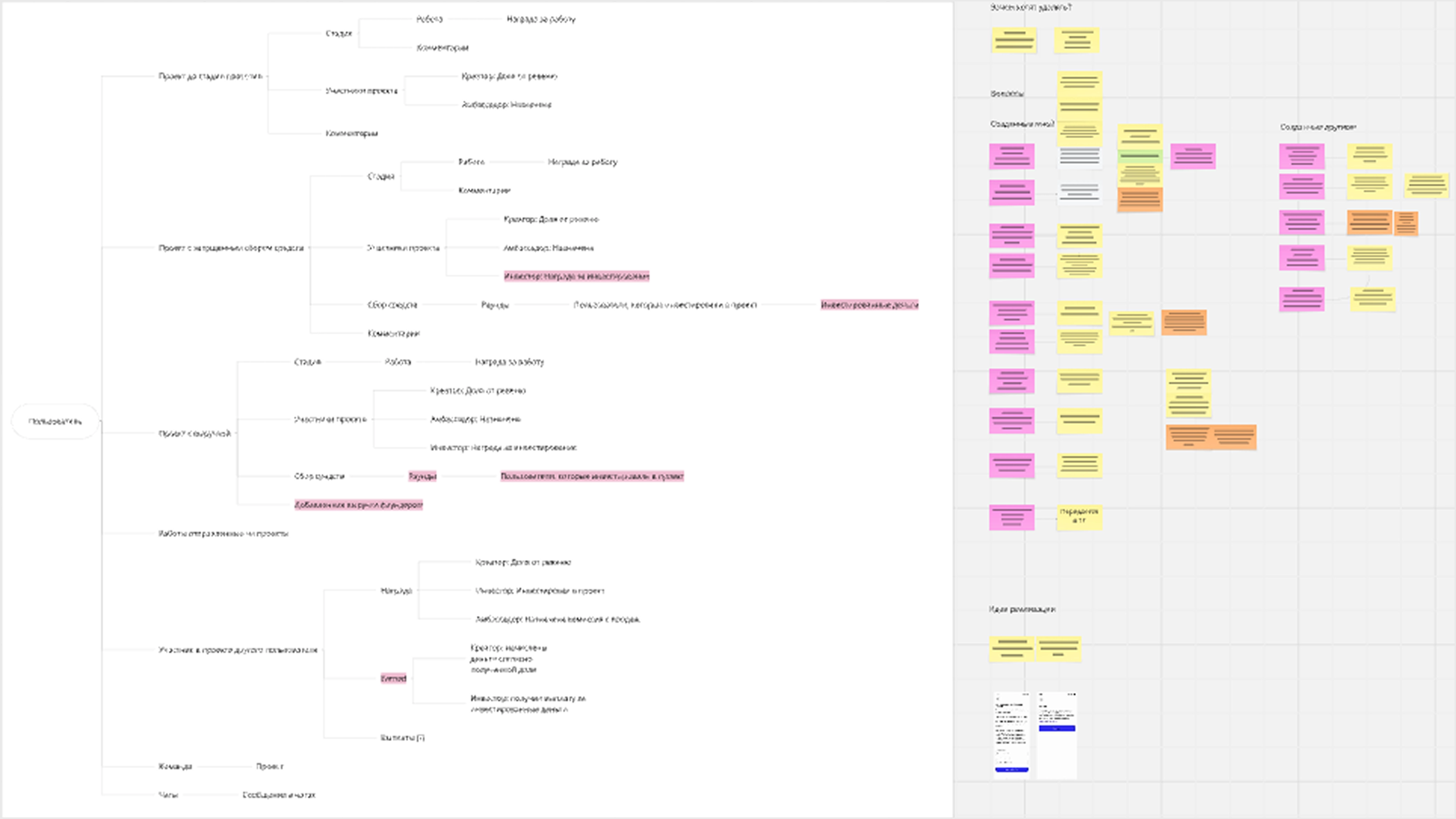 С помощью User Story Mapping структурировали путь пользователей разных ролей — от фаундера, запускающего идею, до инвестора и конечного покупателя. Мы выделили ключевые этапы: создание проекта, привлечение креаторов, формирование команд, инвестиции и запуск производства, а также обратная связь и продажи готовых изделий. Это дало возможность увидеть «сквозной сценарий» всей платформы, где роли связаны между собой, а контент и действия органично формируют персонализированную ленту.
