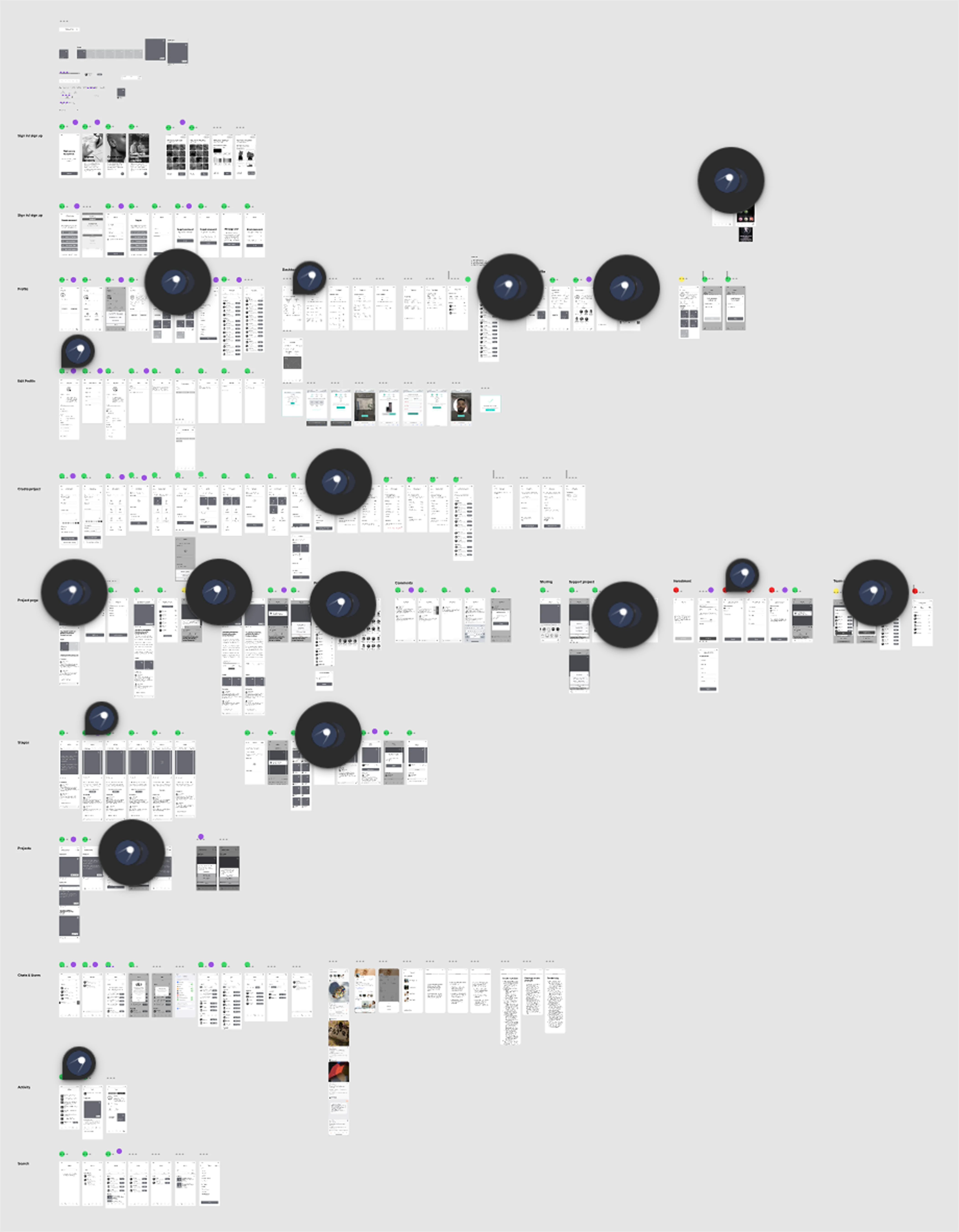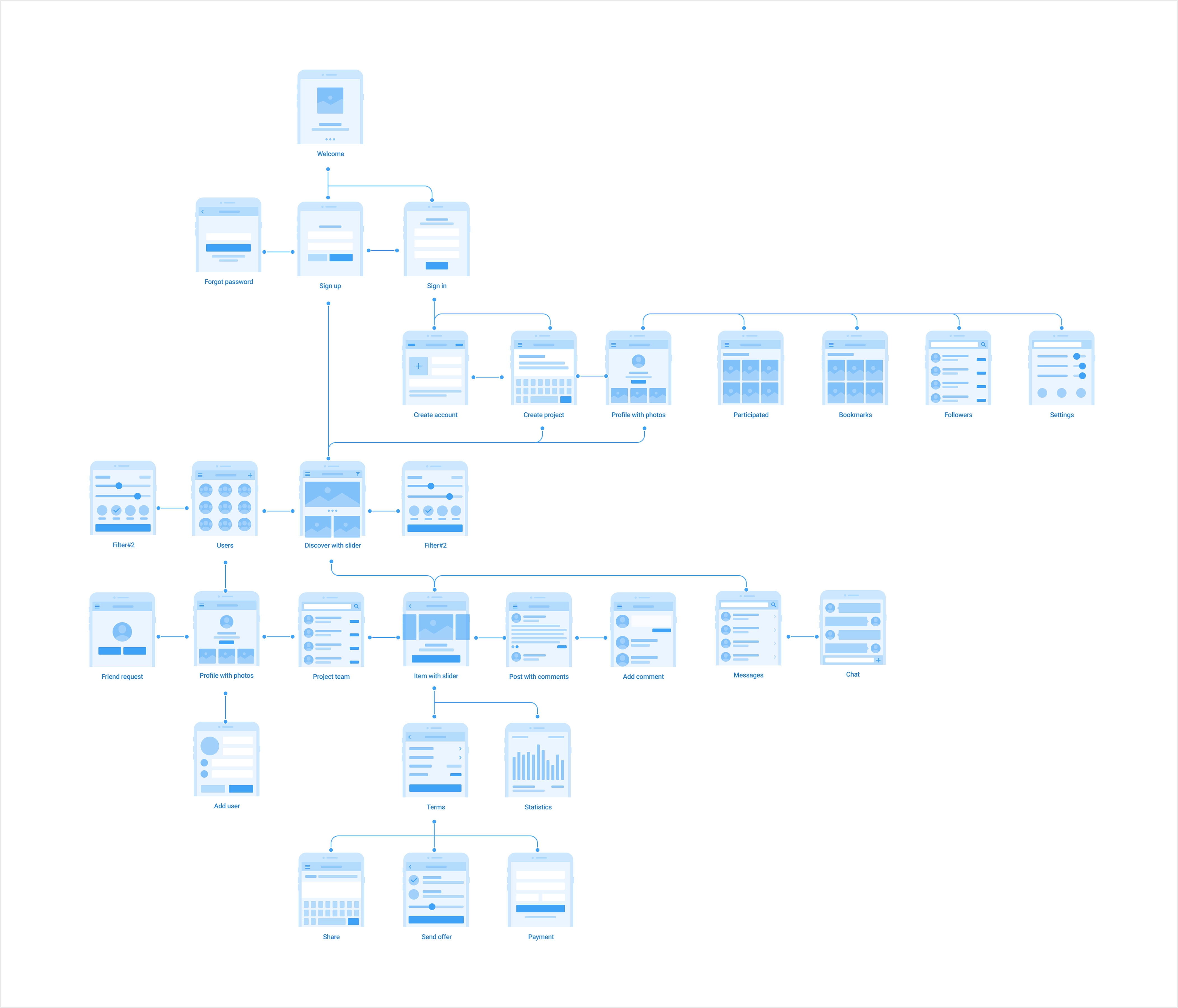 Результаты User flow выделили, как пользователи движутся по продукту от входа до достижения своих целей. Карты помогли выявить избыточные шаги, точки, где пользователь мог теряться, и сценарии, требующие упрощения. Удалось оптимизировать логику переходов между ролями и сущностями, чтобы путь к ключевым действиям (создать проект, вложиться, прислать работу, купить изделие) стал более прямым и предсказуемым.